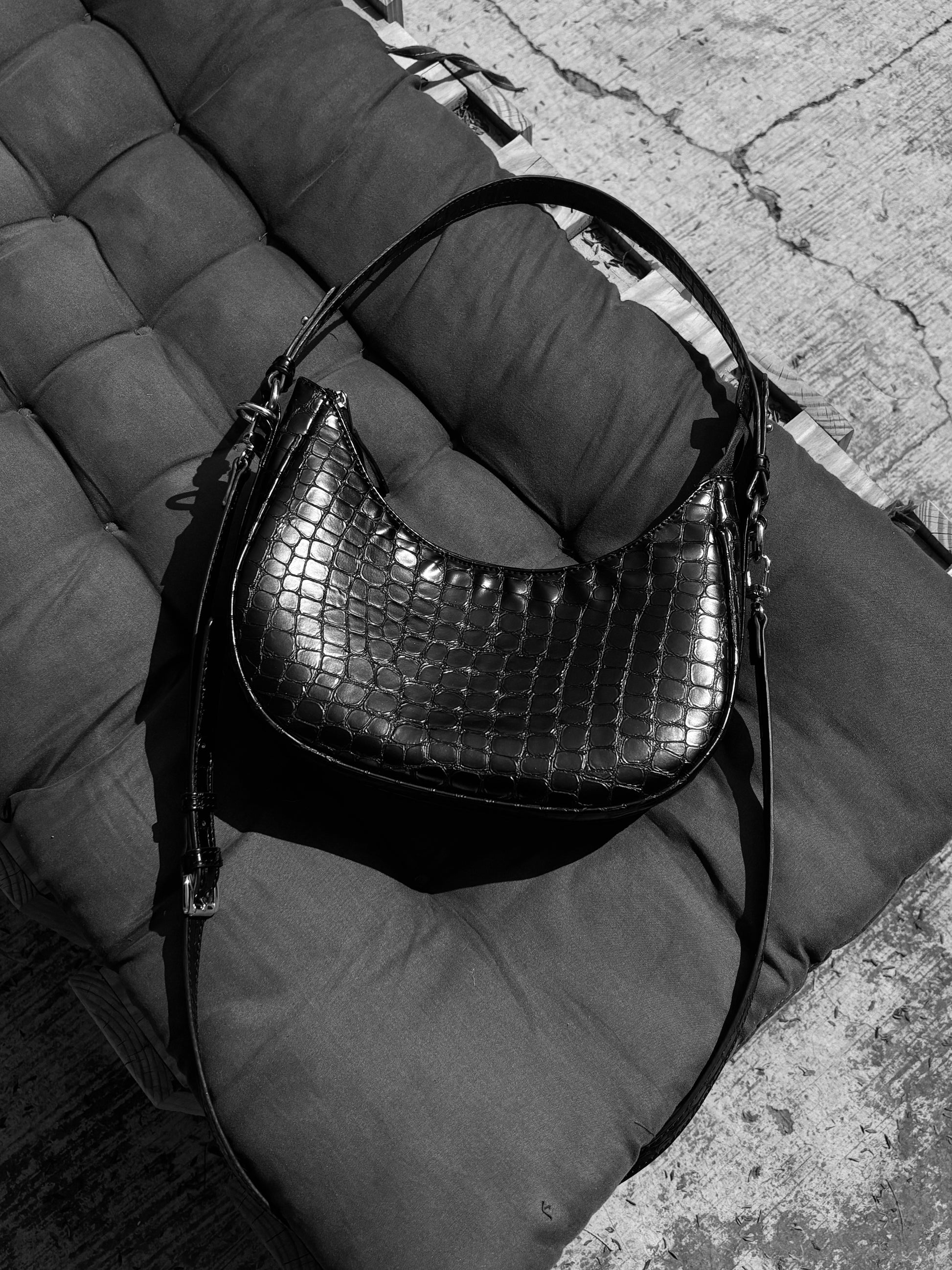 Bolsa con textura tipo croco en piel vegana que eleva cualquier look sin esfuerzo.